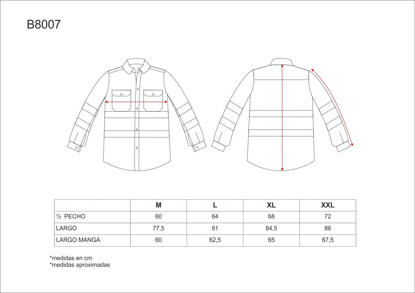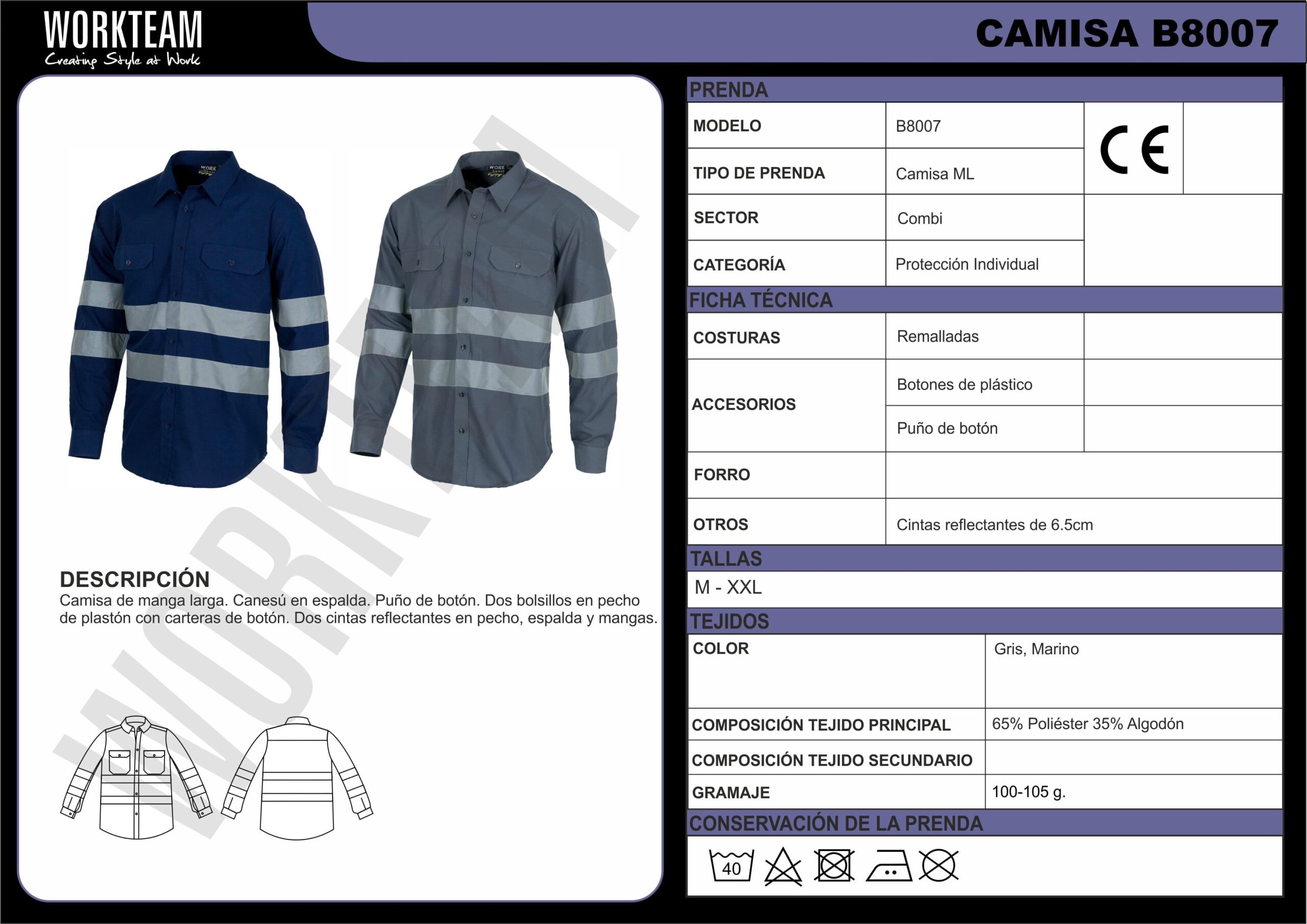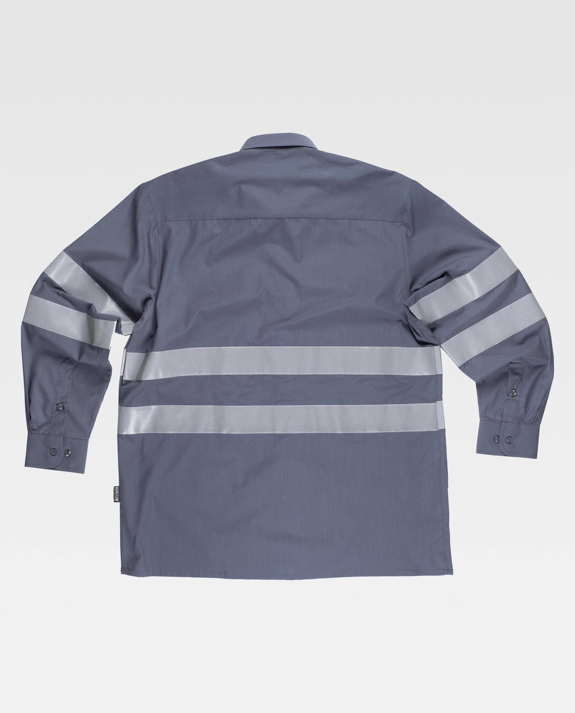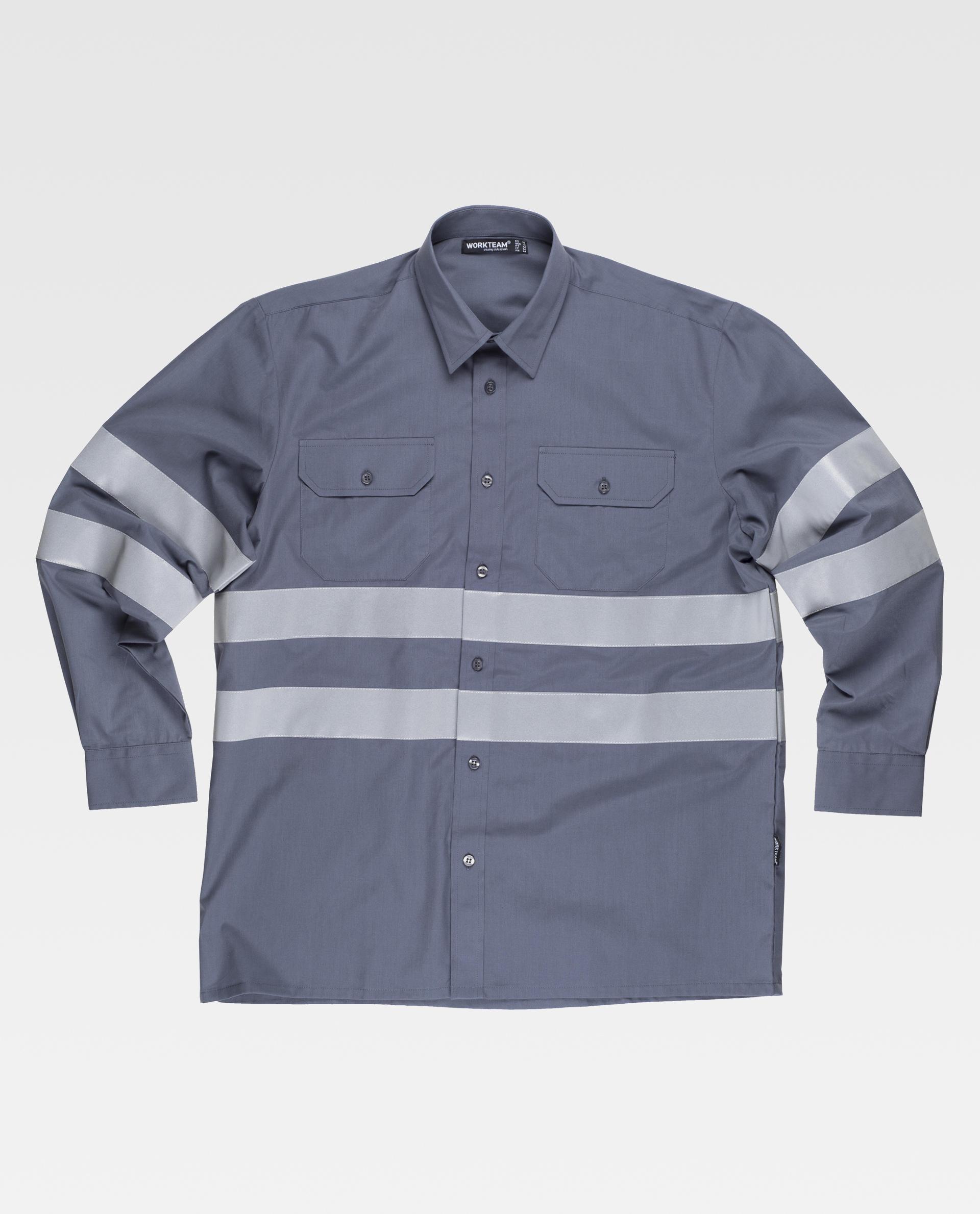 Camisa de manga larga con cintas reflectantes. Cuello clásico y cierre central de botones. Dos bolsos de pecho de plastón con cartera de botón. Dos cintas reflectantes en pecho, espalda y mangas. Puño de botón. Espalda con canesú.